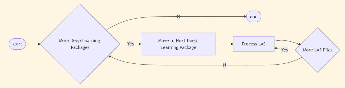 My computer is no slouch. It’s got a pretty new processor and has 32GB of RAM. But, it clearly had some trouble with this workload. So, I refactored my code to go through the LAS files directly—it grabbed each LAS in the directory (I had them all saved in the same place, ran the tool, then moved on. It also did this for each deep learning package. It looked something like this: