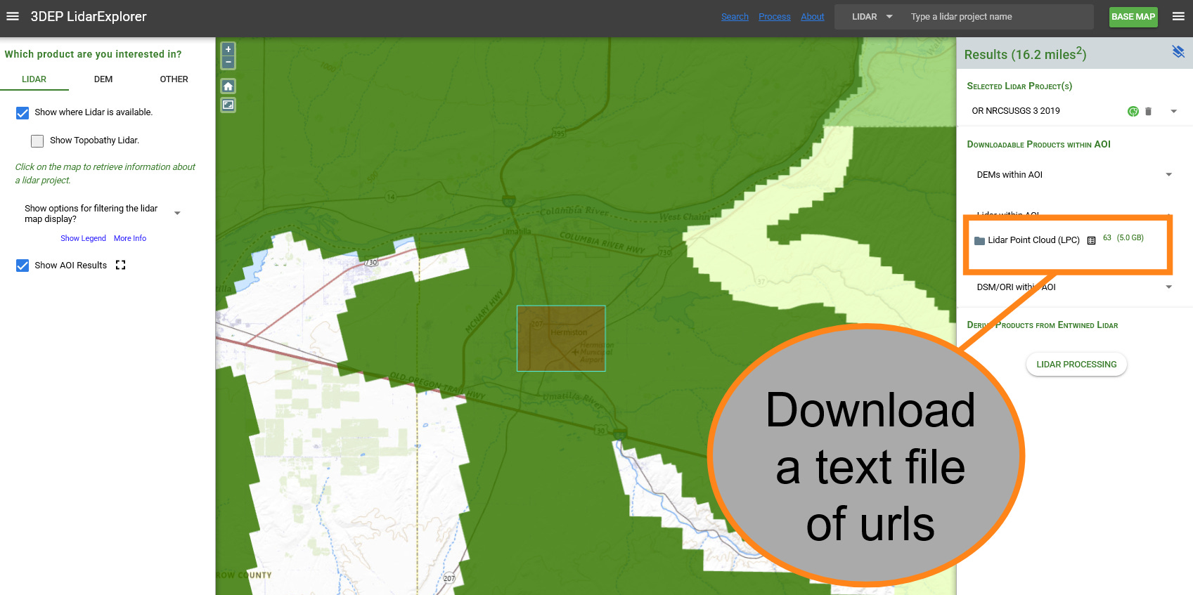 Using the LiDAR Explorer was straightforward. You could draw a rectangle around your area of interest and search for point clouds in that area. The coverage for an individual point cloud is rather small, likely because larger point clouds would become prohibitively large in size, especially on the web. If you’re interested in a small area, you might just download those point clouds using the Explorer. For our purposes however, we are trying to model a large portion of the city of Hermiston, which equates to about 58 point cloud files. For that, I chose to download a text file of url download links. If you were to copy a single url and paste it into your browser, it would begin downloading that file immediately.