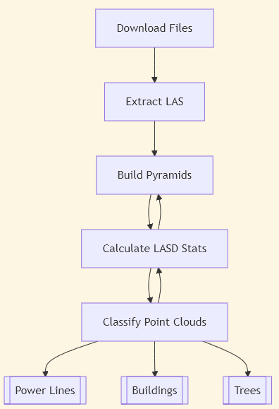 Before we get into the processing steps, let’s review what we’re doing here: We’re evaluating the Esri deep learning packages against publicly available and easy-to-retrieve LiDAR data. The chart below shows the steps taken to go from step A to step Z, but that is with the benefit of hindsight. As an exploratory process, all I really knew at the beginning was that I was going to download the data, and apply the Power Lines deep learning package to it (I also ended up adding Buildings and Trees to the mix)