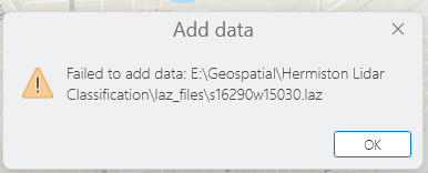 There are likely some applications that can display LAZ files natively, however the LAZ file is a lossless compression format, meaning the data is compressed to keep the file sizes smaller. There is a trade-off to this: performance. A compressed format means applications have to do more work to show you the data, converting from that compressed format on the fly. LAS, on the other hand, is not compressed, and therefore not subject to the performance drawbacks of compression. I say all this to say that Esri has clearly made the calculation that displaying LAZ would be too slow, and therefore did not build into ArcGIS Pro the ability to read it—instead, we must convert it first.